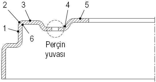 Belirlenen maksimum perçin yüküne göre yapılan gerilme analizi sonucunda kapak diliminde elde edilen von Mises gerilmesi dağılımı Şekil 16'da görülmektedir. Kapak kesitini oluşturan ve Şekil 17'de görülen yüzeylerde ortaya çıkan maksimum gerilme değerleri Tablo 4'te verilmiştir. Bu gerilmeler, kesitin numaralandırılmış köşelerinde çevre boyunca ortaya çıkan maksimum değerlerdir.