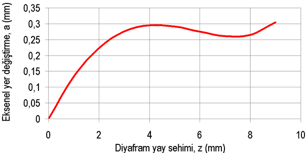Maksimum perçin kuvveti için gerçekleştirilen analiz sonucunda kapakta ortaya çıkan en yüksek elastik şekil değişimi, vites kutusu giriş mili eksenine en yakın çapta, 0,41 mm olarak ölçülmüştür. Kapak esnemesinin ölçümünde referans olarak alınan perçin yuvalarında, Şekil 18'de görülen a= 0,29 mm'lik maksimum şekil değişimine rastlanmıştır. Bu değer, parçanın tasarım aşamasında öngörülen a= 0,3 mm sınır değerinin altında kalmaktadır. Kapağın gerçek çalışma bölgesi olan z= 6-8 mm'lik yay sehimi aralığında ise a= 0,26-0,28 mm ile sınırlanmaktadır. Perçin yuvalarında ölçülen eksenel yer değişiminin, diyafram yay sehimine bağlı değişimi Şekil 19'da verilmiştir.