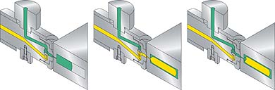 Şekil 2.7. Tabla dönerek sarı parçanın olduğu göz yeşil rengi enjekte eden yolluğu karşılıyor. (4) |