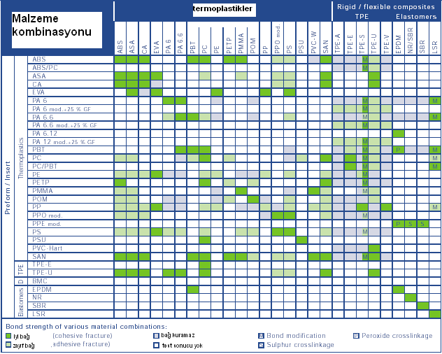 Ko enjeksiyonda kullanılan malzemeler arasında kimyasal olarak bağ oluşmak zorundadır. Birbirinden farklı iki malzeme bağ kurup birbirine yapışmalıdır. Her malzeme birbirine bağ kuramaz ve yapışamaz. Bu teknikte malzeme seçimi çok önemlidir. Ko enjeksiyonun faydalarından biri de maliyeti düşürmek olduğu için örnek olarak yüzey kalitesi önemli olan bir parçada yüzeyde kaliteli malzeme kullanırız fakat çekirdek önemli olmadığı için ucuz plastik kullanmak avantajlı olacaktır. İşte kullanacağımız bu plastikler arasındaki bağ plastik seçimini etkiler. Aşağıdaki tabloda plastik malzemeler arasında bağlar görülmektedir.(1) (9)