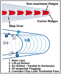 Sağdaki resim: Sıkı bir radyusu frezelerken oluşan çıkıntılar sıfır bindirmeli trokodial takım yolu kullanılarak temizlenebilir. Bu metotta takım geri gelme hareketi işlenecek parçanın Z ekseninde yükseltilir daha sonra ileri hareketin devamında daha iyi bir yüzey kalitesi sağlamak için takım yoluna tanjant olarak dalar.