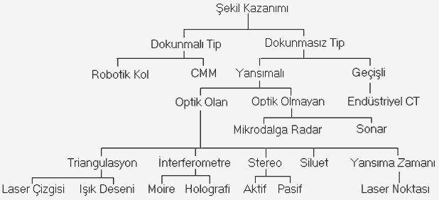 İş parçalarından sayısal veri toplamak amacıyla uygulanan teknikler dokunmasız ve dokunmalı metotlar olmak üzere iki grupta incelenmektedir. Dokunmasız metotlardan ızgara projeksiyonu ve laser ölçme metodu en çok kullanılan optik veri toplama teknikleri olarak tanınmaktadır. (Şekil 1)