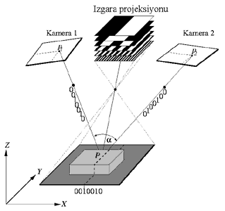 Izgara projeksiyonu metodu, siyah ve beyaz şeritler halindeki desenlerin ölçülecek yüzey üzerine bir sıra halinde projeksiyonu temeline dayanmaktadır. Bu desenler, bir LCD projektör vasıtasıyla mümkün olduğunca eşit iki parçaya bölünen siyah ve beyaz çizgilerden oluşmaktadır (3) (Şekil 2).