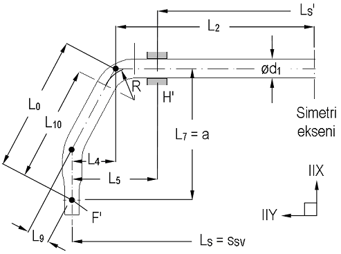 Stabilizatör çapı, bacak yataklarına indirgenmiş yay katsayısı cS' üzerinden, Şekil 14'te görülen temel boyutlar üzerinden hesaplanmıştır. Bu boyutlar, gövde iskeleti elemanları ve aks yapı elemanlarının Şekil 2'de görülen konumları dikkate alınarak belirlenmiştir. Uygulamada, stabilizatörler genellikle aksa ve gövdeye H-H' ve F-F' noktalarından elastik elemanlar yardımıyla yataklanmaktadır. Viraj hareketi sırasında bu elemanların şekil değişimi ne kadar fazla olursa, bacakların elastik şekil değişimi de o ölçüde azalmaktadır.