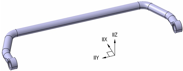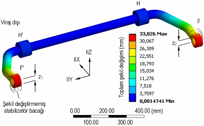 Analiz için, F ve F' bacak yataklarına, Şekil 17'de görüldüğü gibi, Z doğrultusunda ve birbirine ters yönde z1= z2 = 30 mm sehim verilmiştir. Stabilizatör gövdesindeki elastik şekil değişimi dağılımı Şekil 17'de görüldüğü gibidir.