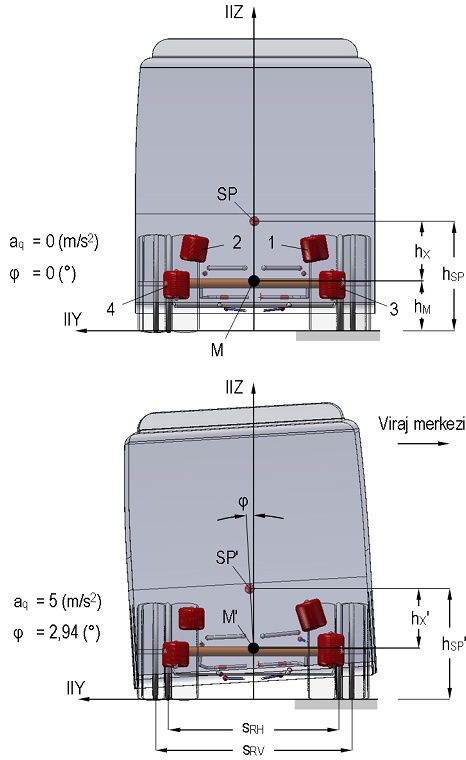 Çapı belirlenen stabilizatörün mukavemet analizi, taşıtın tutunma sınırlarında yapacağı varsayılan bir viraj dönüşü sırasında, bacaklarda ortaya çıkacak şekil değişimi üzerinden gerçekleştirilmiştir. Yol-tekerlek arası yan kuvvet bağıntı katsayısının ortalama, µS 0,5 kabul edilmesi durumunda taşıt, aq 5 m/s^2 gibi oldukça yüksek bir yanal ivmede savrulma sınırına gelmekte ve bu durumda Şekil 13 üzerinden  3º olarak bulunmaktadır. Böylece (15) bağıntısı yardımıyla, = 5,46º ve z1= z2= 30 mm değerleri elde edilmektedir. Şekil 16'da, aq=5(m/s2)'lik yanal ivme için gövdenin YZ düzlemindeki hareketi görülmektedir.