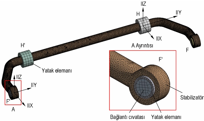 Hazırlanan katı model, gerilme analizinin gerçekleştirilmesi amacıyla ANSYS® Workbench V11.0 ticari sonlu elemanlar yazılımına aktarılmıştır. Stabilizatörün sonlu elemanlar modeli Şekil 17'de verilmiştir. Bu modelde her biri üçer doğrusal serbestlik derecesine sahip toplam on düğümden oluşan SOLID187 elemanı kullanılmıştır [15]. Sonlu elemanlar modeli, 74.360 eleman ve 131.971 düğümden oluşmaktadır. Stabilizatör gövdesi, H-H' ve F-F' yatak elemanlarıyla, bu elemanlar içinde/üzerinde dönebilecek ve Y doğrultusunda sınırlı olarak öteleme yapabilecek şekilde ilişkilendirilmiştir. Bacak yatakları her üç eksende de serbest bırakılmıştır. Modelde, yatak elemanlarının kauçuk esaslı oldukları varsayılmıştır. Elemanların elastisite modülü, kauçuk için kabul edilen Emaks= 0,1 GPa ve Poisson oranı, kauçuk esaslı malzemeler için öngörülen v 0,5 değerleriyle dikkate alınmıştır [16, 17]. Analizde, yatakların sınırlı şekil değişimleri için malzeme özellikleri lineer izotropik olarak tanımlanmıştır.