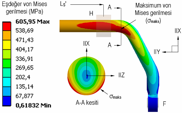 Yapılan analiz sonucunda elde edilen gerilme dağılımı Şekil 18'de görülmektedir. Buna göre, eşdeğer von Mises gerilmesinin sırt bölgesinde = 490-510 MPa aralığında kaldığı, H ve H' yataklarının bacak tarafında ise maksimum maks 606 MPa değerine kadar yükseldiği belirlenmiştir. Bu da malzemenin akma sınırının %76'sına tekabül etmektedir. Parça genelinde en düşük emniyet katsayısı n= 1,32 olarak hesaplanmıştır.