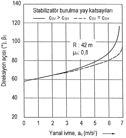 Taşıt süspansiyon sistemlerine stabilizatör eklenmesi, viraj hareketi sırasında düşey tekerlek yükü değişimini artıracağından, tekerleğin yol düzleminde tahrik/fren kuvveti ve yan kuvvet taşıma kapasitesinin değişmesi gündeme gelmektedir. Bu durum, tekerleklerin diyagonal hareketini ve dolayısıyla taşıtın özgül yönlenme davranışını değiştirmekte, doğrultu kontrol ve stabilizasyon özelliklerine doğrudan ve dolaylı olarak etkimektedir [19]. Şekil 19'da, ön ve arka aksında stabilizatör bulunan bir taşıtın viraj dönüşü sırasında, farklı burulma sertlikleri için direksiyon açısı ihtiyaçları karşılaştırılmıştır [20]. Buna göre, ön aks stabilizatörünün arka aksta bulunandan sert olması durumunda, taşıtı aynı çaplı virajda tutmak için direksiyon simidine verilen açı, her iki akstaki stabilizatörün eşit sertliğe sahip olması durumuna göre artar. Bu da taşıtın az döner (understeer) karakteristiğe sahip olması yani virajın dışına doğru sapma eğilimi taşıması anlamına gelir. Taşıtın yalnızca ön aksına stabilizatör eklenmesi durumunda da özgül yönlenme davranışında belirli ölçüde bir değişimin ortaya çıkması beklenir. Stabilizatörün mekanik tasarımında takip edilebilecek bir yöntemin açıklanması ve gerçek bir ağır taşıta uygulanması ile sınırlandırılmış bu çalışmada, seçilen katsayının, taşıtın özgül yönlenme davranışına etkisi kapsam dışında tutulmuştur. Süspansiyon sistemi tasarımında bu noktanın da gözden uzak tutulmaması gerekir. Yay ve stabilizatör seçimi yapıldıktan sonra, lastik tekerlek için uygun bir matematik modeli de içeren daha kapsamlı modeller kullanılarak taşıtın özgül yönlenme davranışı değerlendirilmelidir. Sonuçta, stabilizatör katsayısı ve çapının belirlenmesi, taşıtın hem yanal hem de yol düzlemindeki dinamik davranışlarının bir arada incelendiği bir optimizasyon problemi halini almaktadır.