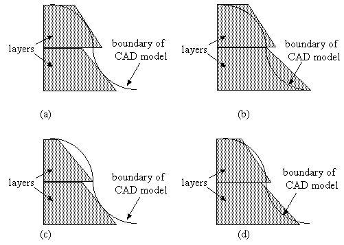 CAD yüzeyine ve uygulanan stratejiye bağlı olarak katmanların 4 farklı metodla kesilebileceğini gösteren bir çizim yukarıda gösterilmiştri. Bu konuda detaylı bilgi ve hesaplamayla ilgili gerekli formüllere aşağıdaki makalelerden erişilebilir. Bu makalelerin üçünün online versiyonları da mevcuttur: