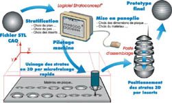 Stratoconception sistemi, inşa yöntemiyle talaşlı imalatın bir melez çözümü olan, 3D CAD modelinin kalın katmanlara ayrıldıktan sonra parçalar halinde işlenip sonrasında birbirlerine yapıştırılmasıyla imalat prensibine dayanır. Kesim ve işleme için CNC tezgahlar, lazer veya su jeti kullanılır. Aynı teknoloji orotopetik protezler imal etmek için de revize edilmiş ve OrthoStrato Concept® ismiyle kullanılmaktadır: www.cirtes.fr/orthostrato
