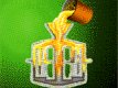 bir sıvıyı 125 adet meme vasıtasıyla püskürtüyordu. Sağda, 3DP prosesine ait animasyondan