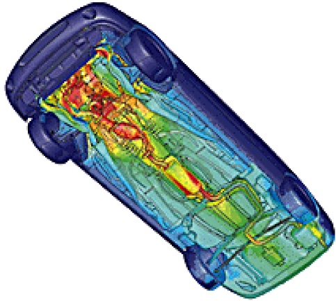 Aerodinamik değişiklikler ve estetik gereksinimler araçların gittikçe daha ufak kaput altı boşluğa sahip olmalarına ve buna bağlı olarak ön ızgara girişlerinin gittikçe ufalmasına sebep olmaktadır. Ayrıca kaput altına eklenmesi gereken her parça genel olarak sıkışık olan bu bölümdeki soğuma için gerekli olan havanın geçebileceği boşluktan bir miktarını daha ortadan kaldırır ve ortamın sıcaklığının hassas bileşenler için çok sayılabilecek değerlere çıkmasına neden olabilir. HAD yöntemleriyle bu bölgelerdeki akış ve ısı transferi incelenebilir ve olası problemler önceden fark edilebilir. Şekil 5'te binek bir araç için yapılmış analizden elde edilmiş sıcaklık dağılımlarını görebilirsiniz. Geometrinin karmaşıklığının yanında fiziksel zorluklar (türbülans modellemesi, radyasyonla ısı transferi) da içeren bu tip akışlar çözümlenerek uygun modifikasyonları yapmak ve ısıl güvenilirliği üst seviyeye çıkarmak mümkün olmaktadır.