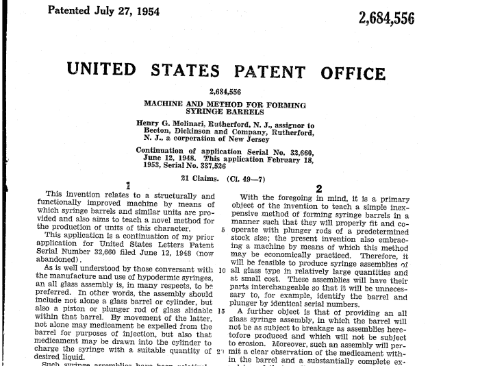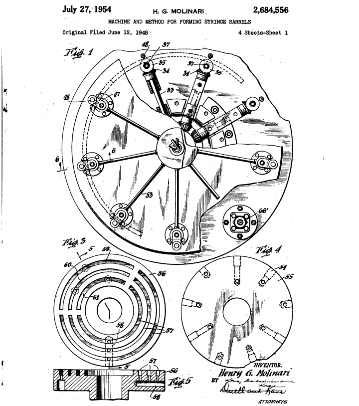 Şırınga imalatı konusunda, 1954 yılında Becton Dickinson firması üzerine alınmış, Henry G. Molinari'ye ait 2,684,556 no'lu patentin 1. ve 5. sayfaları yukarıda görülmektedir;
