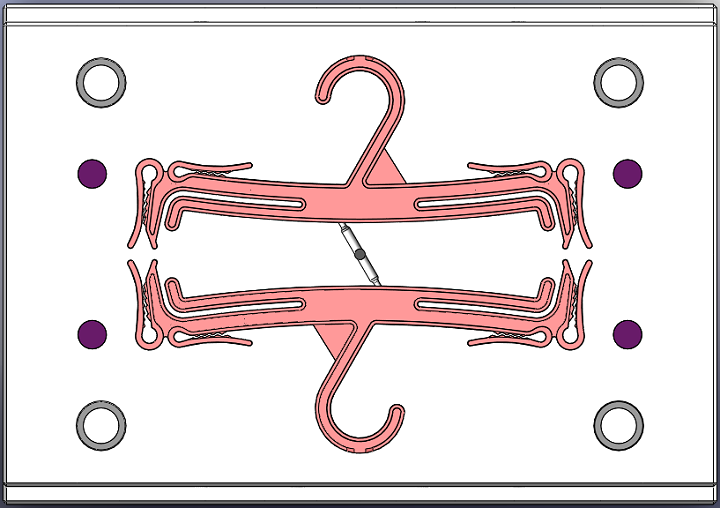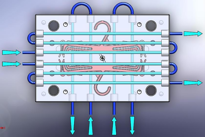Soğuma zamanı çok uzun olan yerin soğutmasını iyi yaparak yani su kanalını o bölgeden yakın geçirerek bu olumsuzluğu gidermiş oluruz. Kalıpta su kanalını Tahmini Kalite ve Soğuma Kalitesi analizlerini dikkate alarak aşağıda görüldüğü gibi üst çelikten yatay altı adet ve parçada soğuma kalitesinin en kötü olduğu yerden geçirerek, alt çelikten de dört adet ve itici pimlerin arasından geçirebileceğimiz en uygun yerden geçirerek Şekil 13 teki gibi tasarladık.