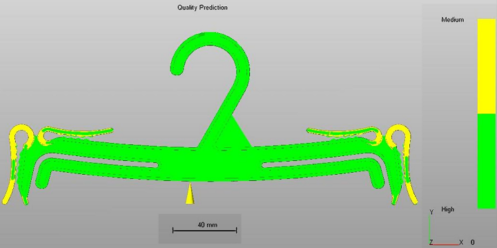 2. Tahmini Kalite Analizi (Quality Prediction): Burada baskıdan sonra parçanın yüzey kalitesi ile ilgili bilgileri alıyoruz. Şekil 11 de yeşil renk yüksek kalite, sarı orta kalite ve eğer kırmızı olsaydı kırmızı bölgelerde de kalitesizlik oluşacağını gösterirdi. Sarı bölgeleri sadece göstermekte kalmıyor bunların neden oluştuğunun bilgisini veriyor. Parça üzerindeki sarı bölgeye tıkladığımız zaman o bölgenin özellikli değerlerine ulaşabiliyoruz. Onlar da parçadaki sadece o bölgenin sıcaklığı, basınç düşüşü, dolum süresi, soğuma süresi ve diğer bilgiler. En önemlisi de orta kalitenin neden oluştuğunu ek bilgi olarak alabiliriz. Örneğin Şekil 11 de gösterilen sarı yerler için, soğuma zamanı çok uzun, bu ilerde ütülemede problem yaratabilir bilgisini kısa öneri olarak veriyor. Ayrıca daha detaylı bilgi almak istediğimizde, bu sonucun neden oluştuğunu, nelerin buna sebep olduğunu ve ileride ne yapılması gerektiğini bilgi olarak alabiliriz.