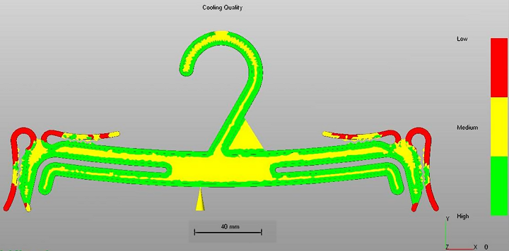 Su kanalının yerini tayin etmek, parçanın soğumak için en uzun süreye ihtiyaç olduğu parça kesitinin fazlalaştığı yerlerin nasıl davranış göstereceğini de dikkate alarak tasarlanması gerekir. Bu aşamada Tahmini Kalite Analizi ile birlikte Soğuma Kalitesi (Cooling Quality) Analizinden de faydalanıyoruz. Tahmini kalite analizinde gösterilen sarı yerler, soğuma zamanı çok uzun, bu ilerde ütülmede problem yaratabilir şeklindeydi. Soğuma kalitesi analizinde de elde ettiğimiz veriler devamdaki alt konu başlığındadır.