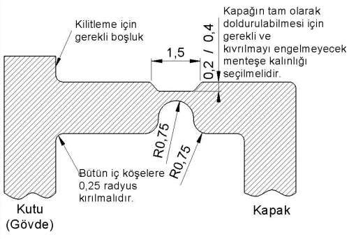 (PE) ve Poliproplen (PP) malzeme için esnek menteşe dizaynı