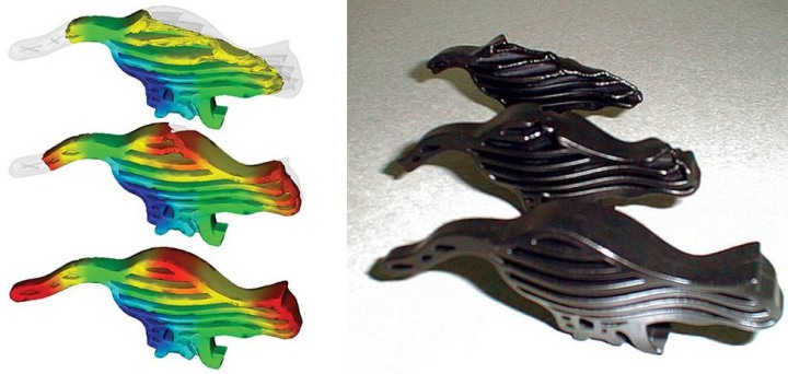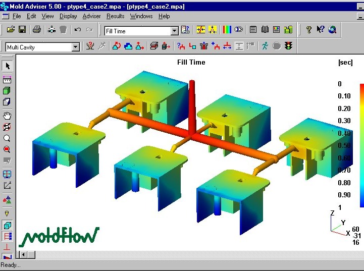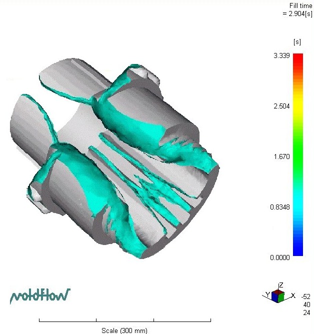 Yukarıdaki şekilde Moldflow programında yapılmış bir analiz ile plastik bir parçanın dolum aşamaları görülmektedir. Şekilden de anlaşılabileceği gibi analiz programına doğru veriler girildiğinde plastik enjeksiyon işlemi birebir simüle edilebilen bir işlemdir.