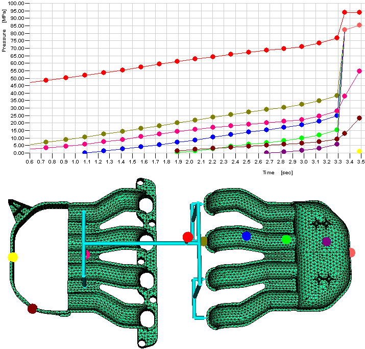 Plastik dolum işlemi sırasında yukarıdaki şekilde de görüldüğü gibi kalıp içerisindeki farklı noktalardan veri almak ve bunları grafik olarak elde etmek mümkündür. Bu da bize dolum esnasındaki plastik hareketi ile ilgili daha detaylı bilgi edinme fırsatı verir.