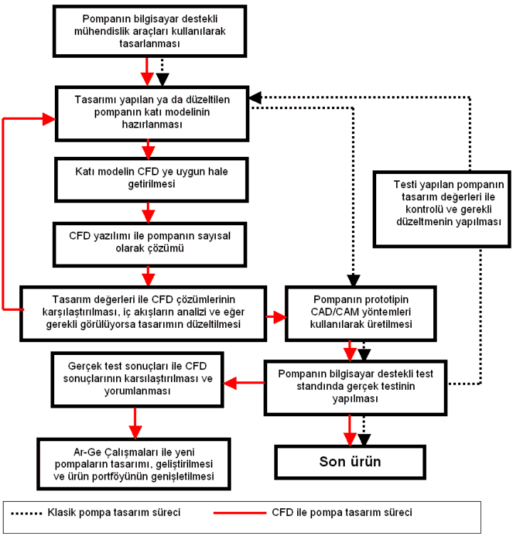 Layne Bowler Pompa Sanayi A.Ş., 2003 yılından beri yaptığı yoğun araştırmalar sonucunda pompa tasarımında günümüzün gerektirdiği ve geleceğe yönelik bu alt yapıyı 2005 yılı başlarında uygulamaya koymuştur. Klasik pompa tasarım süreci ile CFD kullanılan sürecin aşamaları Şekil 1'de görülebilir.