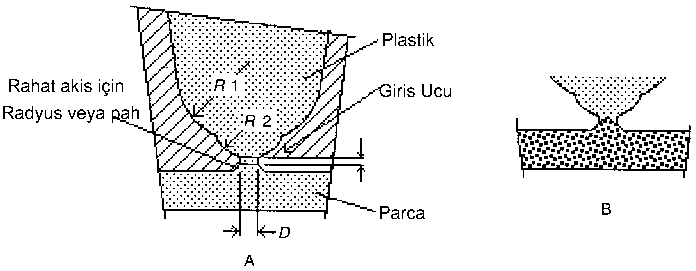 Şekil-1: Silindirik Yolluk Girişi. A-Enjeksiyon sırasında, B-Plastik donduktan sonra.