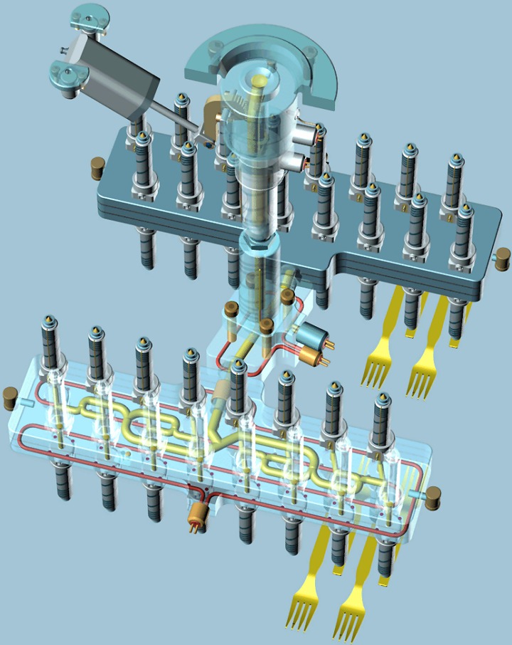 Tek arayüzlü 4 gözlü kalıpta bir çevrimde 4 adet ürün elde edilebilirken, iki arayüzlü 2x4 gözlü kalıpta bir çevrimde ve hemen hemen aynı sürede 8 adet ürün elde edilebilmektedir;