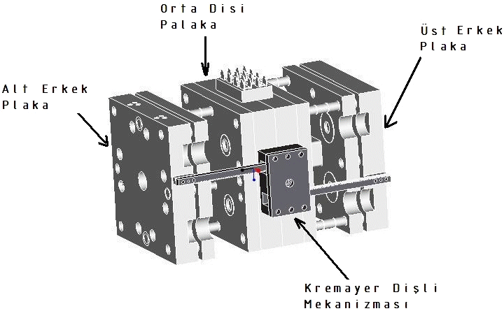 2 yüzeyli stack kalıpta orta plakanın hareketinin sağlanabilmesi için günümüzde 3 belli başlı sistem vardır. Bunlar harmonik kol, kramayer dişli ve helisel dişli mekanizmalarıdır.