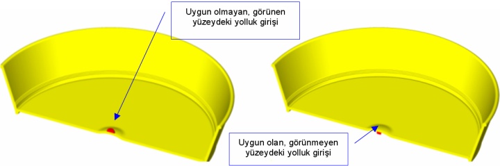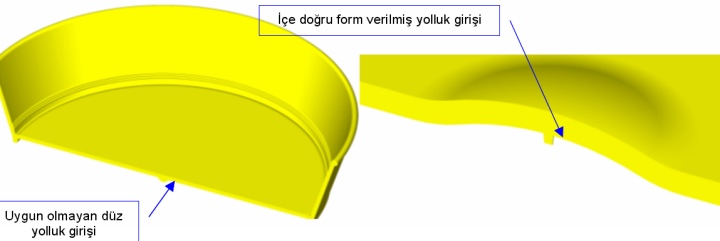- Yolluk girişindeki, plastik parça kalıntısının, ürünün düz oturmasına engel olmaması için, yolluk giriş noktası içe doğru yapılmalıdır.