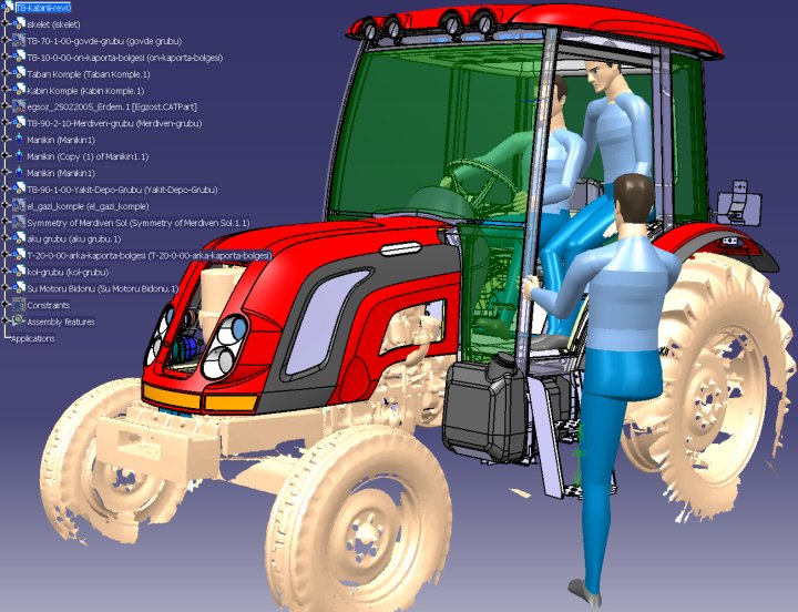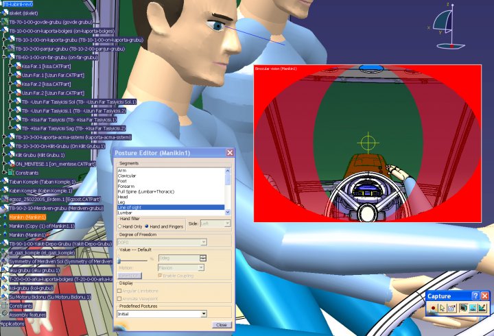 CATIA'nın ergonomi modülünün sağladığı geniş imkanlar dahilinde, henüz tasarım aşamasındayken gerek kullanıcının gerekse diğer yolcuların hareketlerini simüle ediyoruz. Tasarım çalışmalarımızda her ne kadar Sanayii ve Ticaret Bakanlığı'nın ilgili regülasyon şartlarına uyuyor olsak da, gerek bu şartların ilgilendirdiği gerekse ilgilendirmediği bölgelerde kullanıcın ergonomi açısından durumunu inceliyoruz. Bu çalışma için "standart manken" kullanabildiğimiz gibi boyu, kilosu ve diğer özellikleri bizim tarafımızdan tanımlanabilen mankenler de kullanabiliyoruz.