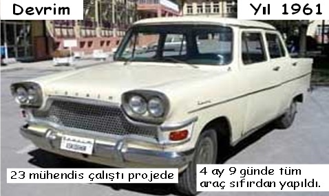 Evet. İlk Türk üretimi otomobili görüyorsunuz. Devrim. Bir çoklarının unuttuğu yada maalesef unuttuğumuz ilk Türk yapımı arabamız. Yıl 1961. başka söze hacet var mı? Uyduruk Japon arabaları karşısında onlardan yıllar önce yaptığımız otomobilin güzelliğine dikkatle bakın tekrar tekrar;