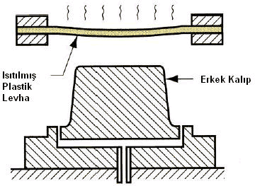 Isıl şekillendirmede plastik levha, ısı ile yumuşatılmış durumda kalıba sıkıca bağlanır. Ara boşluktaki hava emilerek oluşturulan vakum vasıtası ile, ısıtılmış levha; aşağıya, kalıbın üzerine çekilir ve kalıbın şeklini alması sağlanır (1).