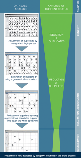 Yöntemimiz sıkıntılarınızı ve benzer parça kullanımlarınızı hemen engelleyerek sizi gereksiz yatırımlardan kurtarmak ve size geniş bir finansal açılım sağlamaktır. İlkönce benzer tanımlama numarasına sahip parça araştırması yapılır, daha sonra farklı tanımlama numarasına sahip benzer parçalar araştırılır. Böylece bu iki adımdan sonra kullanılan parça sayısının önemli derecede azalması sağlanmış olur. Bir sonraki adım ise parçaların geometrik yakınlık araştırmasıdır.