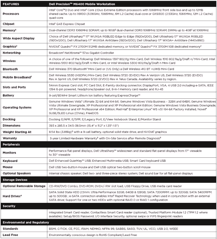 Dell Precision M6400 Covet işlemci olarak yeni nesil Intel Q43 çip setli Inter Core 2 Duo ve Inter Core 2 Duo Exreme Edition Quad-Core işlemciler kullanıyor. RAM hafızası geniş bant aralıklı 1066MHz'lik DDR3 çift RAMlere olanak sağlıyor ve 16GB'a kadar çıkabiliyor. Ayrıca opsiyonel olarak sunulan hafıza özelikleri ile Dell M6400 Covet 1TB'lık depolama olanağı sağlıyor.