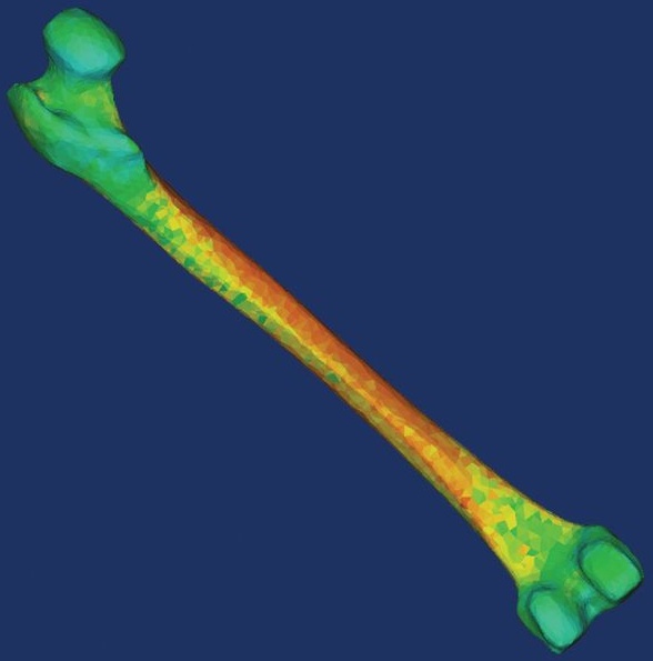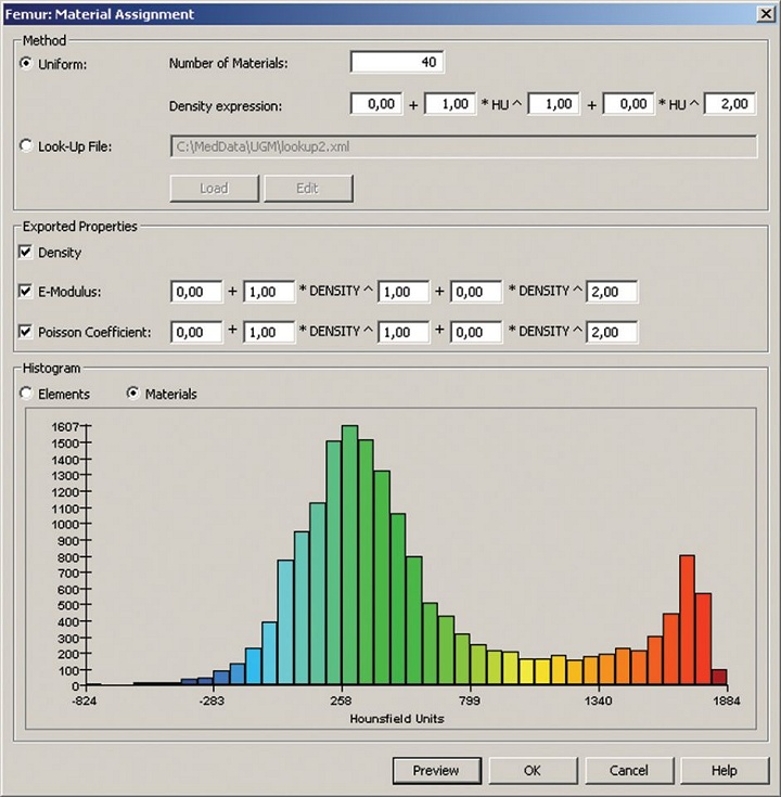 Bu aşamada modeliniz artık sadece bir geometri ibaret değil, aynı zamanda yoğunluk (density) ve bilgi içermektedir. MIMICS bu verileri kullanmanıza yardım etmektedir. Görüntünün gri skala değerlerini (Hounsfield Birimi) bir önceki adımda yarattığınız hacim ağında malzeme özellikleri belirlemek için kullanabilirsiniz. Böylece daha gerçekçi bir simülasyon uygulamanız mümkün olmaktadır.