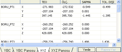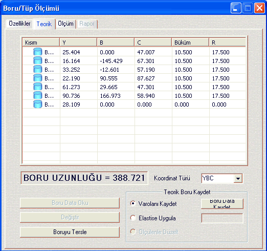 Diğer bir özellik borunun CAD modeli mevcut ise, sadece yazılım üzerinden büküm parametrelerinin çıkarılması sağlanır ve imalata verilir. Normal prosedürde bükülmüş boru ölçülerek CAD modeli ile karşılaştırılır ve grafiksel olarak detaylı raporlanır. Raporlama esnasında isteğe göre XYZ veya YBC parametresine göre raporlanmasını yanı sıra, borunun doğrultması yazılım tarafından otomatik olarak yapılmaktadır. Kullanıcı tarafından talep edilirse borunun değişik referans yerlerine göre kalite kontrol yapılması da mümkündür.
